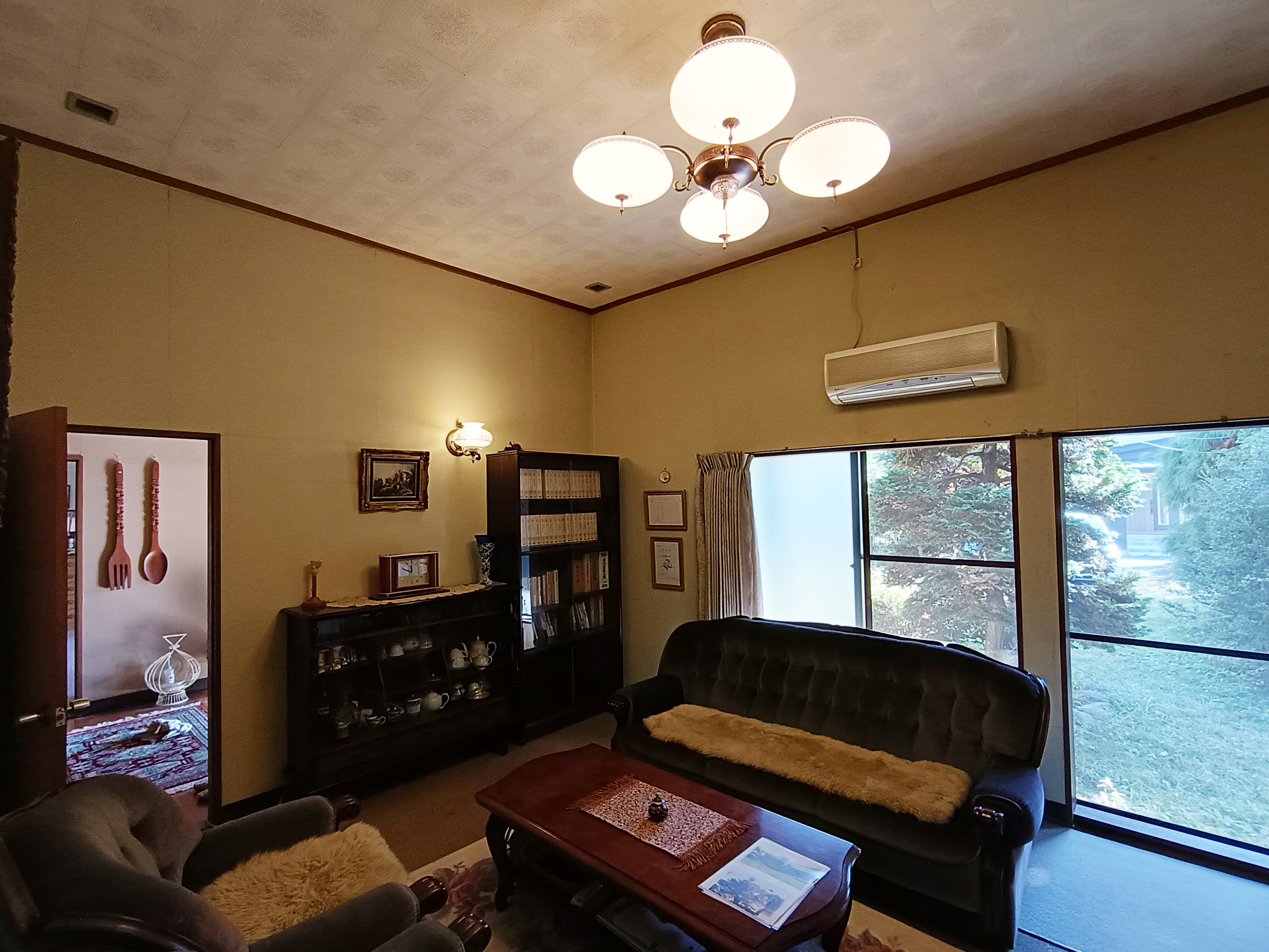 玄関横の10帖洋室です。南面に設置しており、大正ロマン漂う設えになっております。