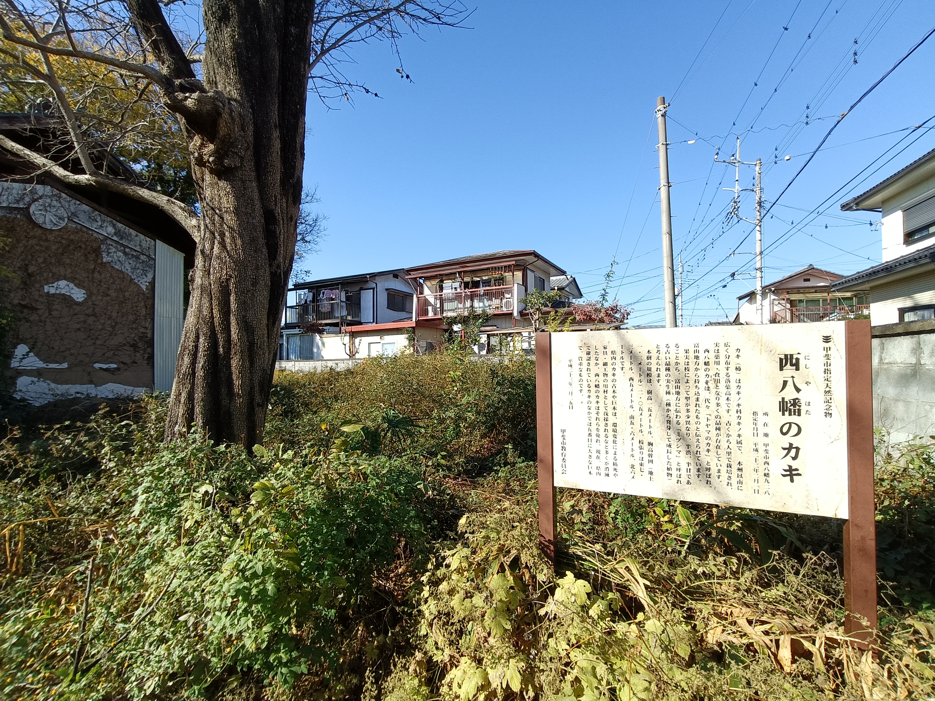 甲斐市、市指定の天然記念物【西八幡のカキ】推定樹齢は300年以上。樹高は15メートルあり、西八幡のカキは数少ないカキの巨木として大変貴重なものです。