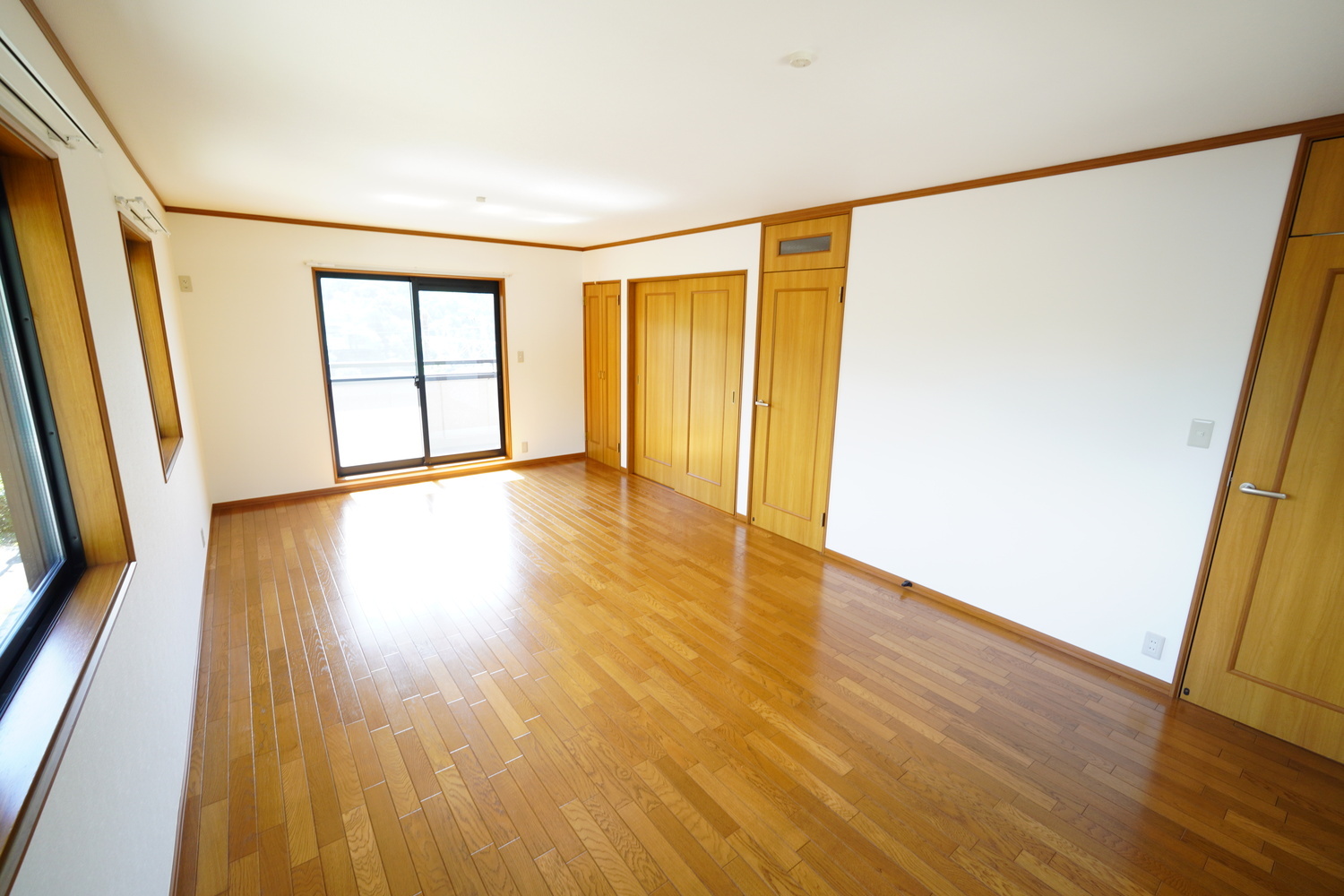 2階 約14帖の洋室です。三面採光で窓が4か所あり、とても明るい空間です。