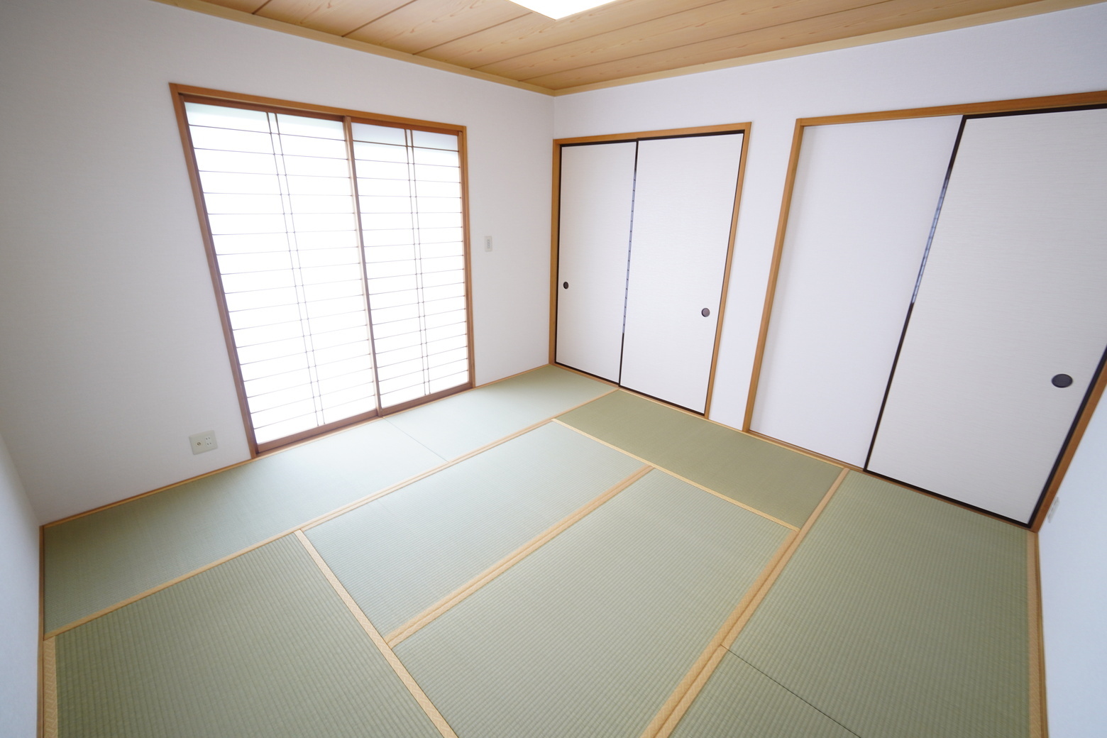 1階8帖和室。二面採光で明るい空間です。こちらの部屋のシャッターは自動なのでとても便利です。
