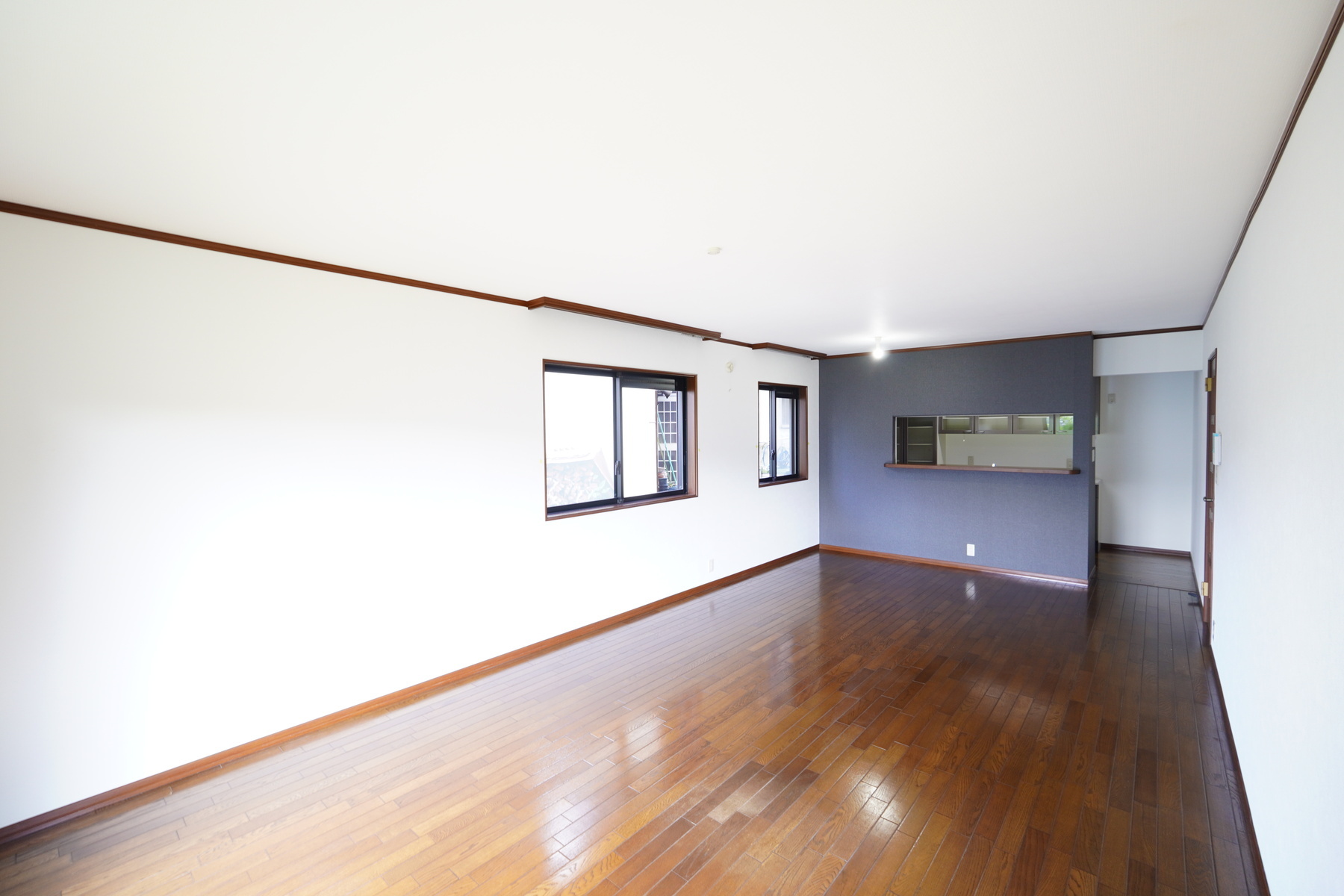 約20帖あるLDKです。腰窓・掃き出し窓から光を取り込み、明るく開放感のある空間です。