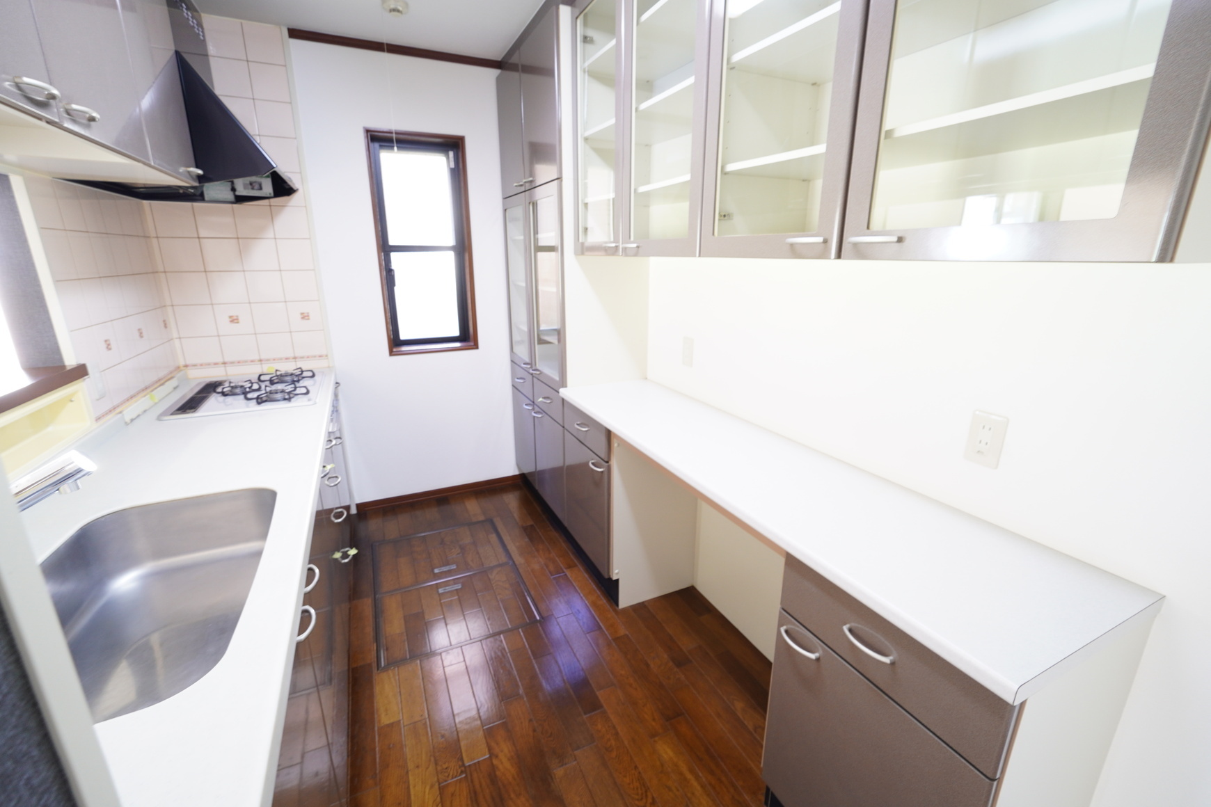 3口コンロを有するカウンターキッチン。十分な収納が確保されており、食器や家電の置場に困りません。