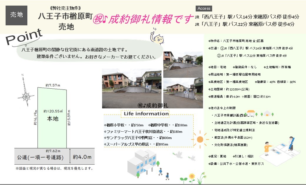 弊社売主物件【八王子市楢原町の土地】販売いたしました。