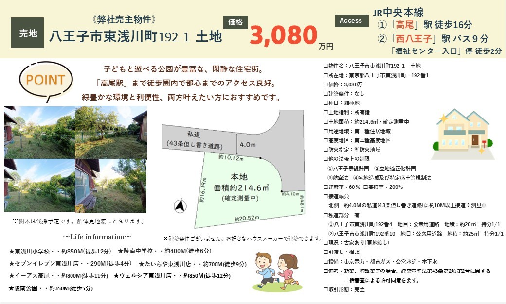 本日は【弊社売主物件】八王子市東浅川の土地(3,080万円)のご紹介です。