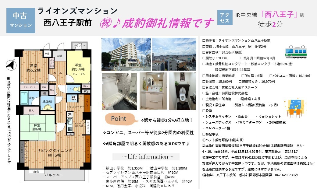 お預かり物件【ライオンズマンション西八王子駅前】販売いたしました。