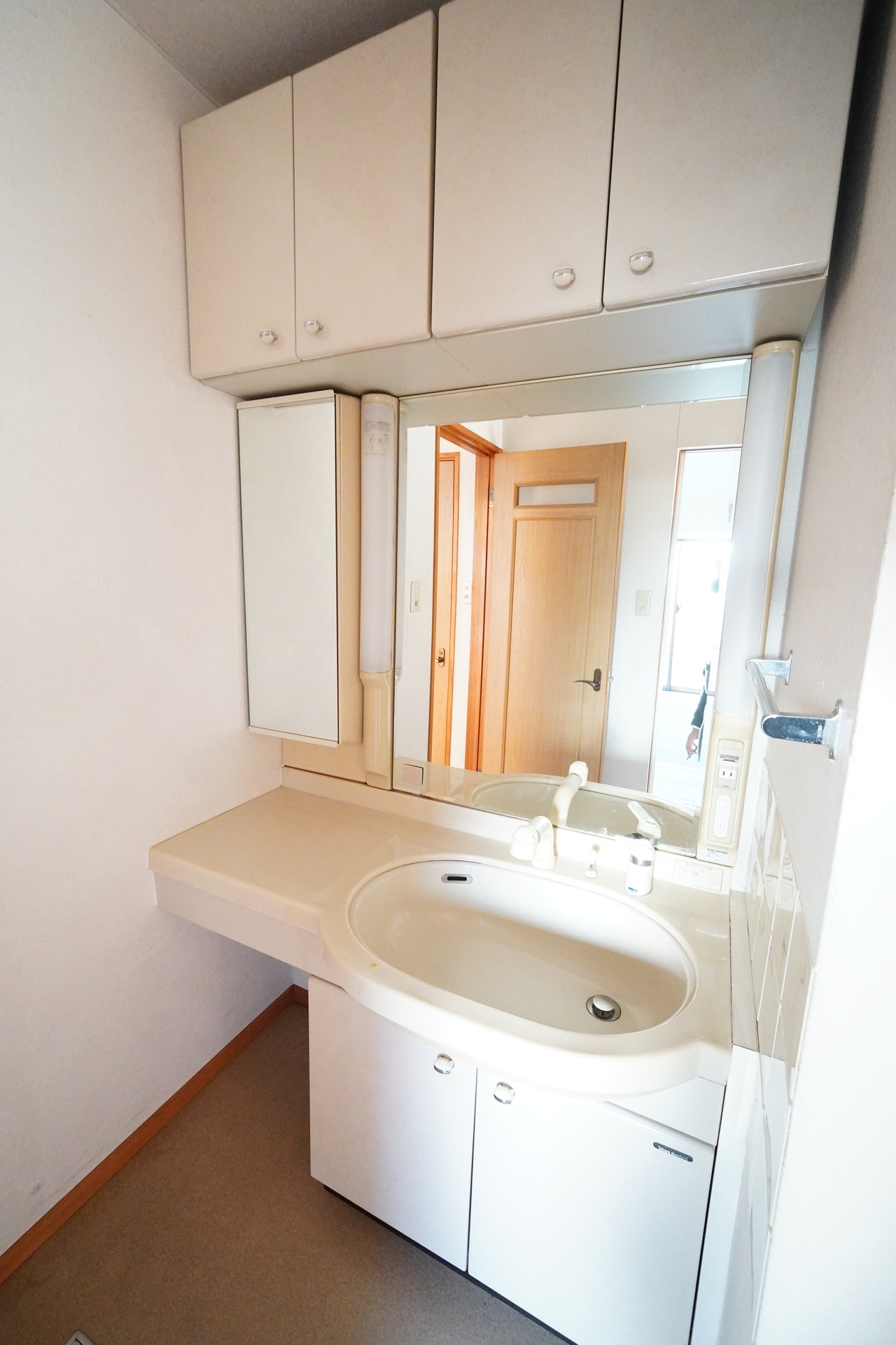 散らかりがちな洗面台ですが、収納棚が豊富でスッキリと見せることができます。