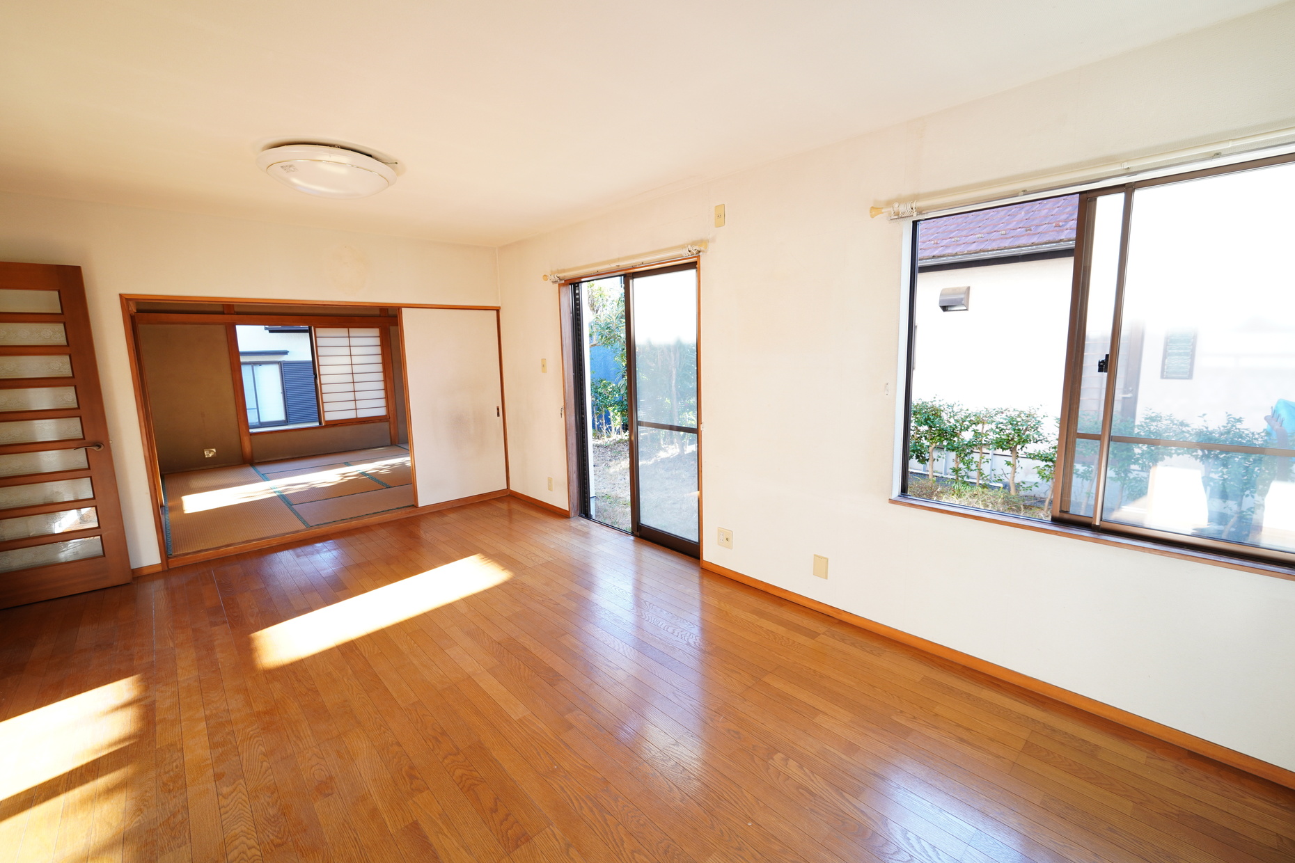 1階リビング。陽当たりが良く昼間は自然光で生活できます。隣の和室と繋げてお部屋を広々と使うことができます。