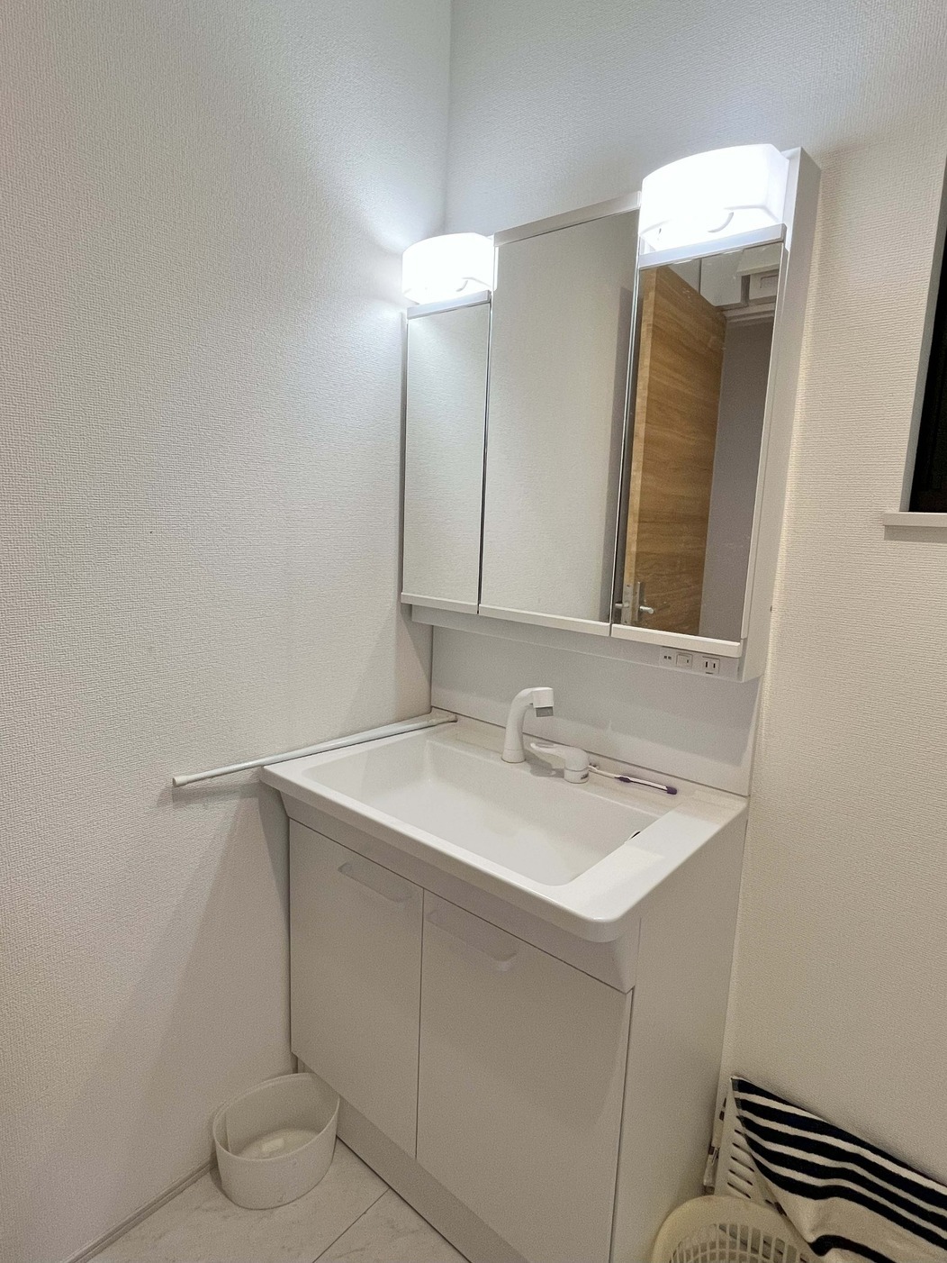 便利な三面鏡は身支度がスムーズに行えます。収納豊富なのもうれしいですね。