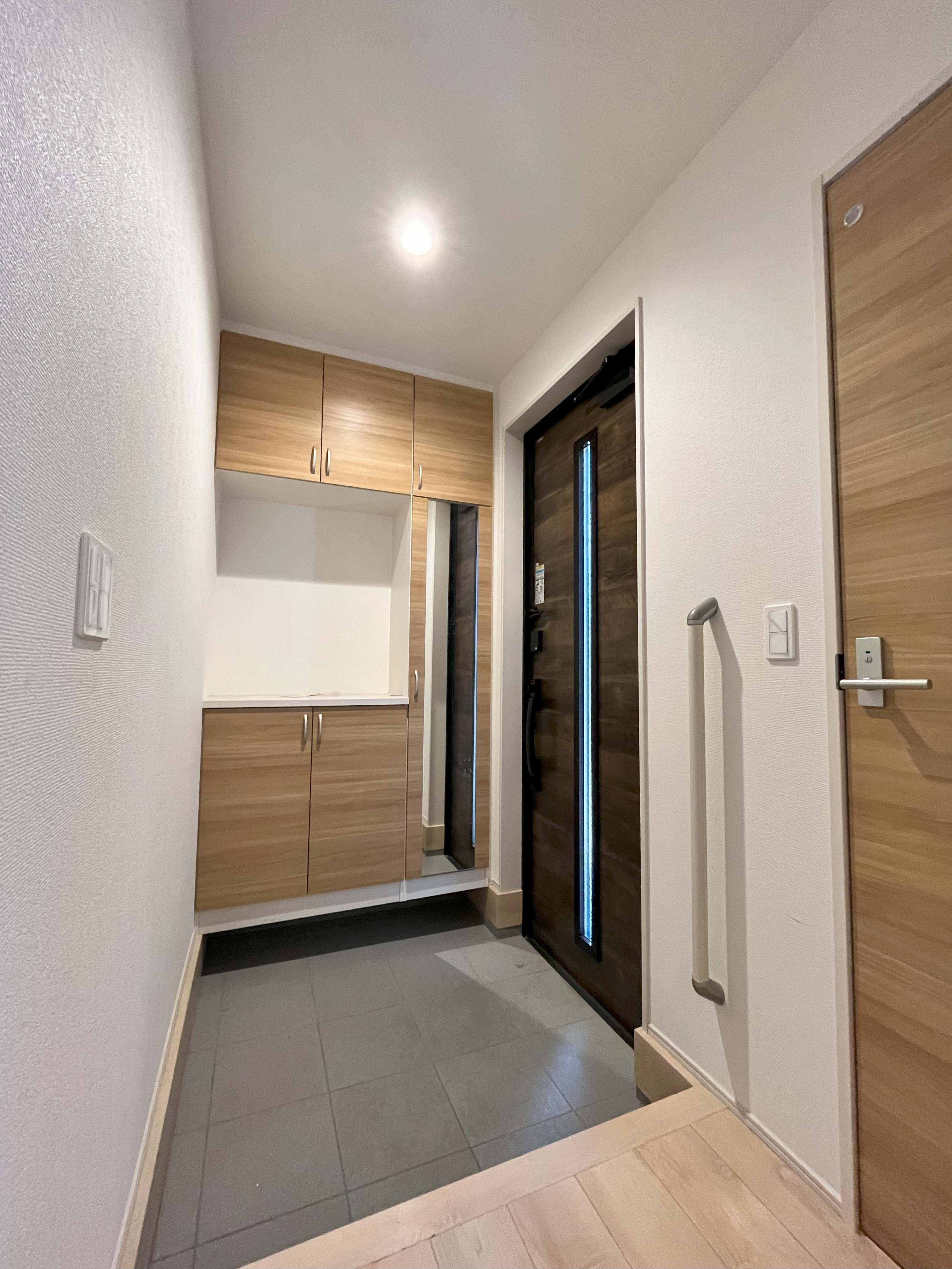 シューズボックスと、外出時にうれしい全身鏡と手摺のある玄関。