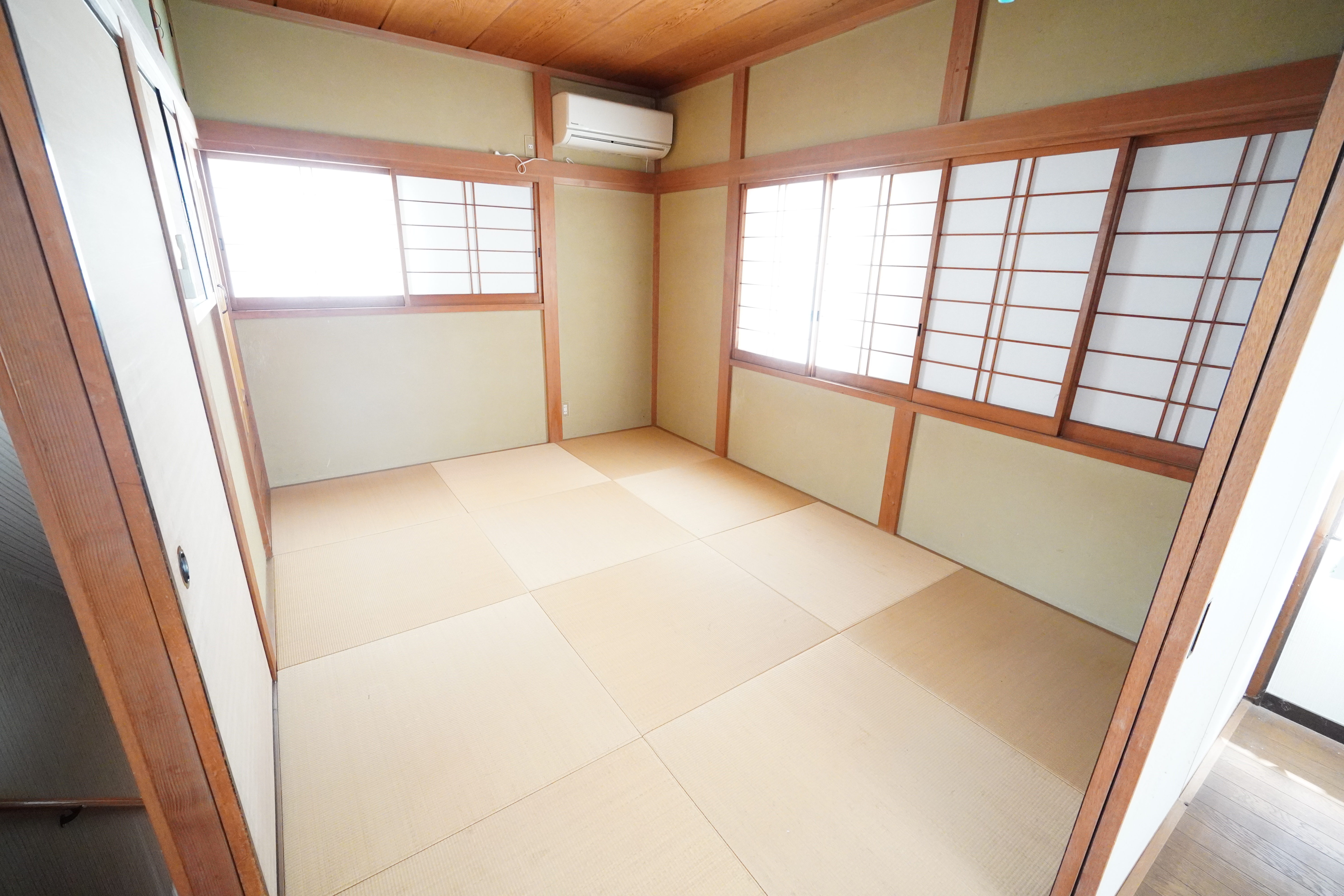 2階 6帖和室。明るい琉球畳を使用しております。二面採光で明るく落ち着いた雰囲気となっております。
