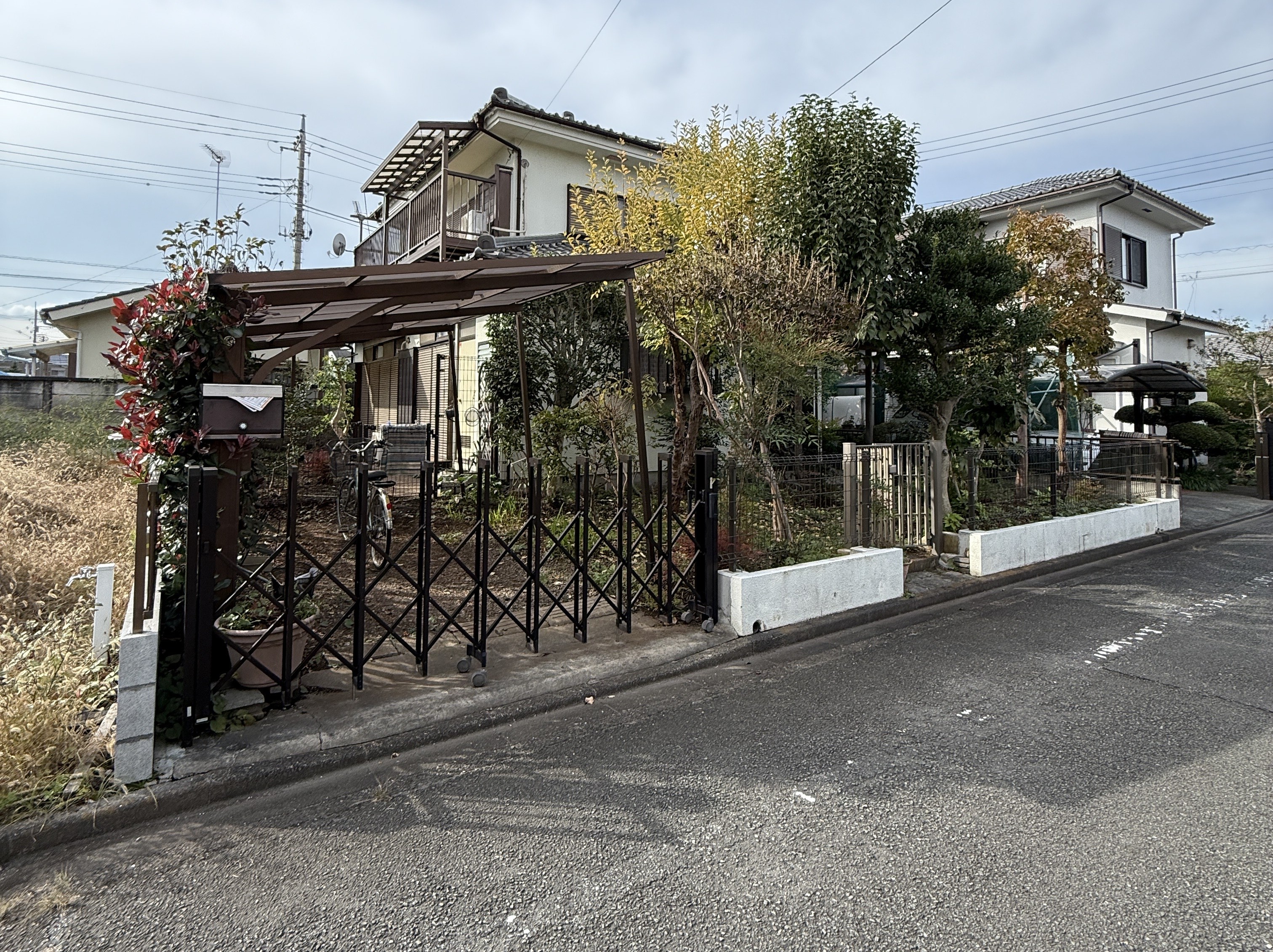 手前がカーポート、その横が前庭となっております。緑が多いとホッとしますね。ガーデニングや家庭菜園も楽しめそうです。