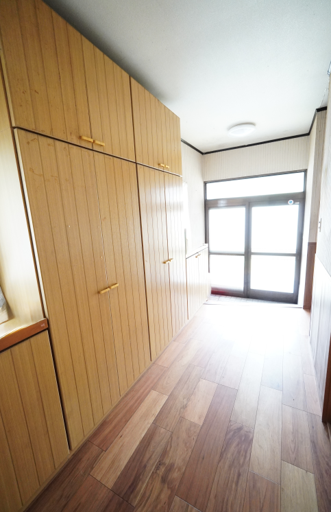 玄関、廊下には大きな収納があり、使わないものをスッキリ収納できます。入口扉と小窓二箇所から光を取り込み明るい空間となっています。