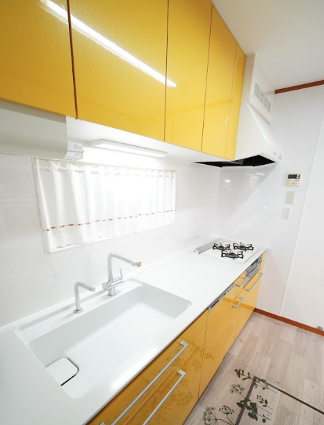 収納たっぷりの3口コンロのシステムキッチン。キッチン背面にもスペースがあるため大き目の棚も設置可能です。