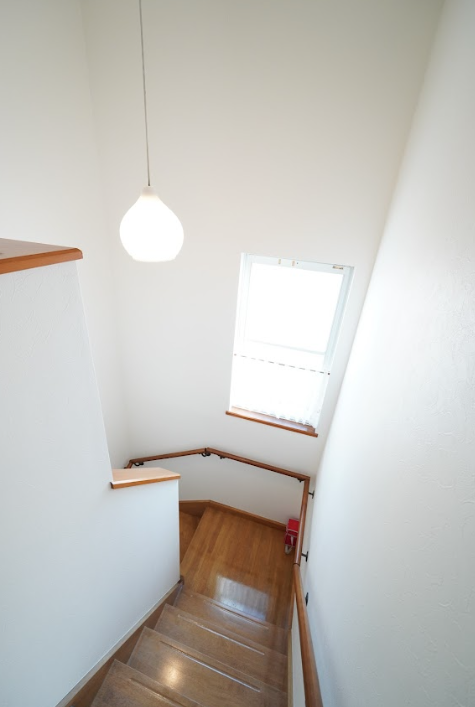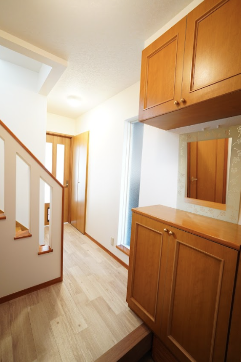 玄関はガレージの窓、階段の窓から光を取り入れているので明るい空間となっております。