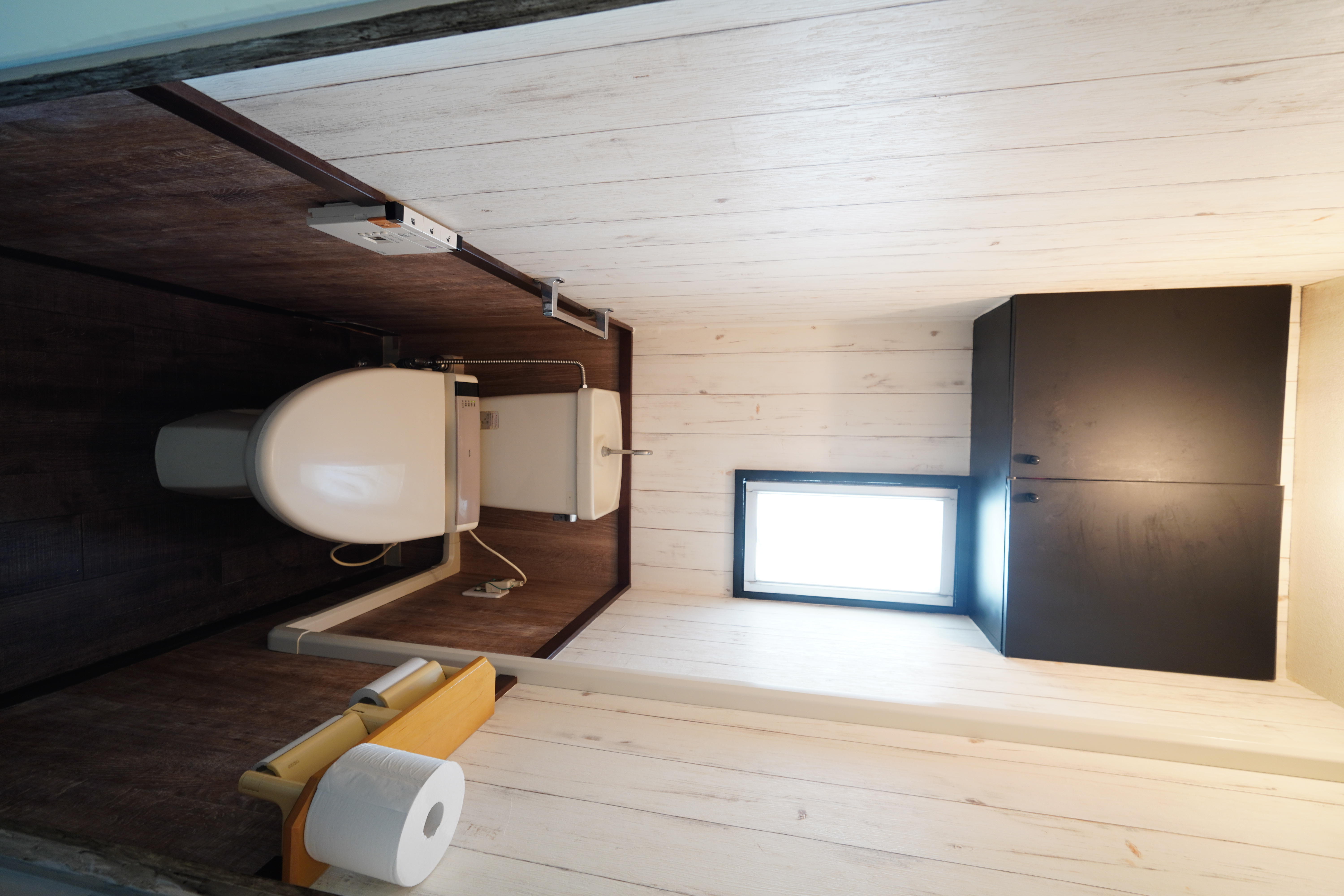 ブラウンのアクセントクロスがポイントのトイレ。天付け収納があり便利です。