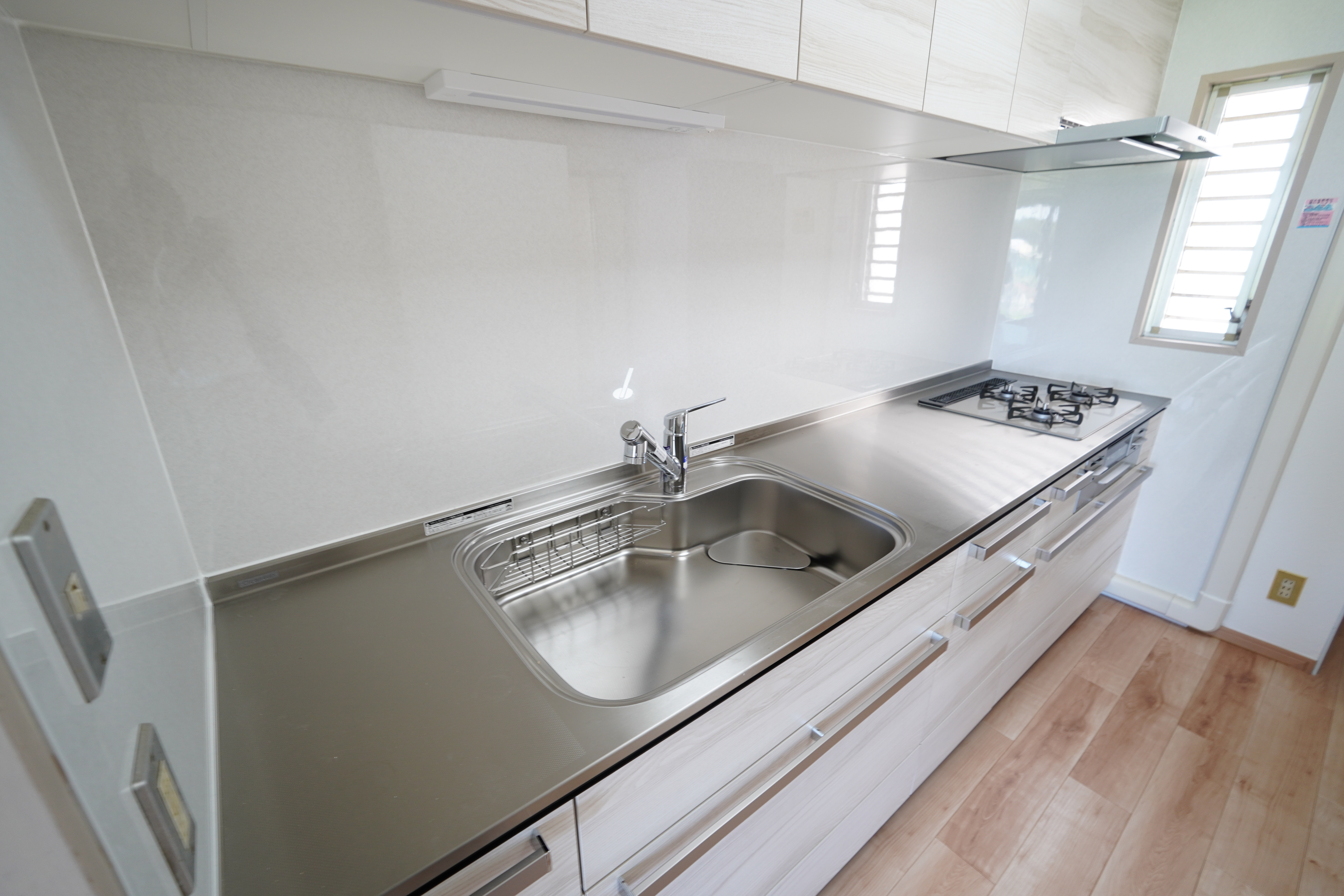 キッチンはリフォームを実施しており新品未使用です。横の小窓から光を取り込み明るい印象になっております。