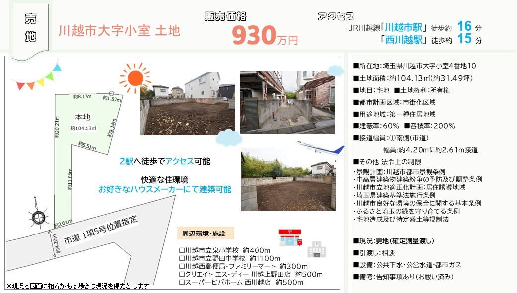 本日は、【弊社売主物件】川越市大字小室の土地 (930万円)のご紹介です。