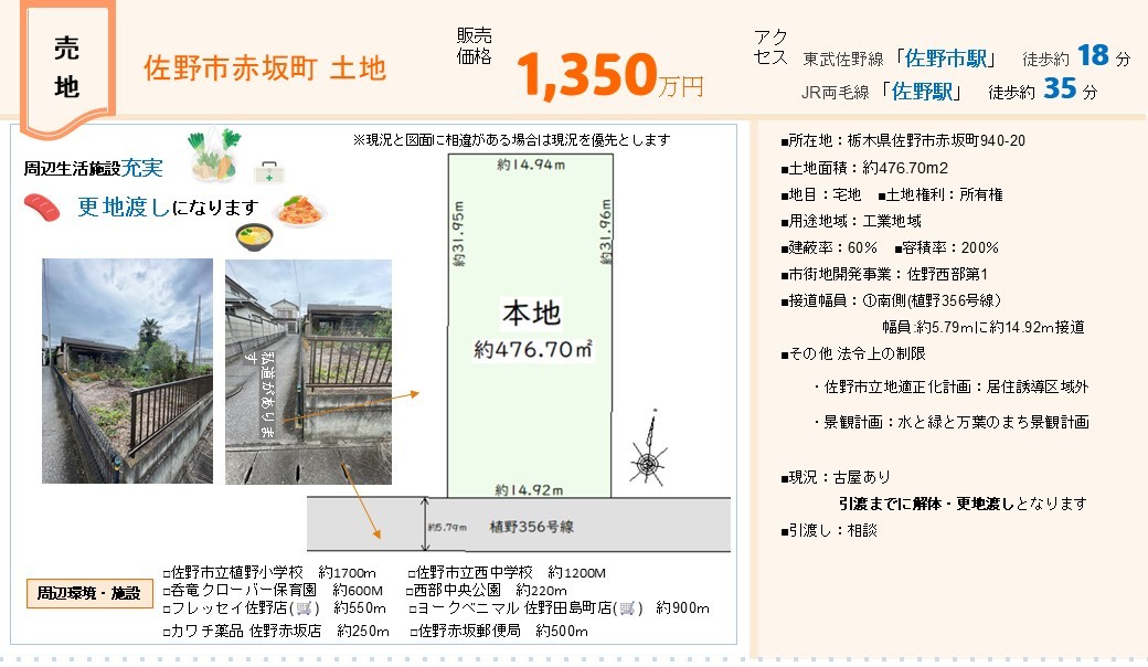 本日は【弊社売主物件】栃木県佐野市赤坂町の売地・1350万円のご紹介です。