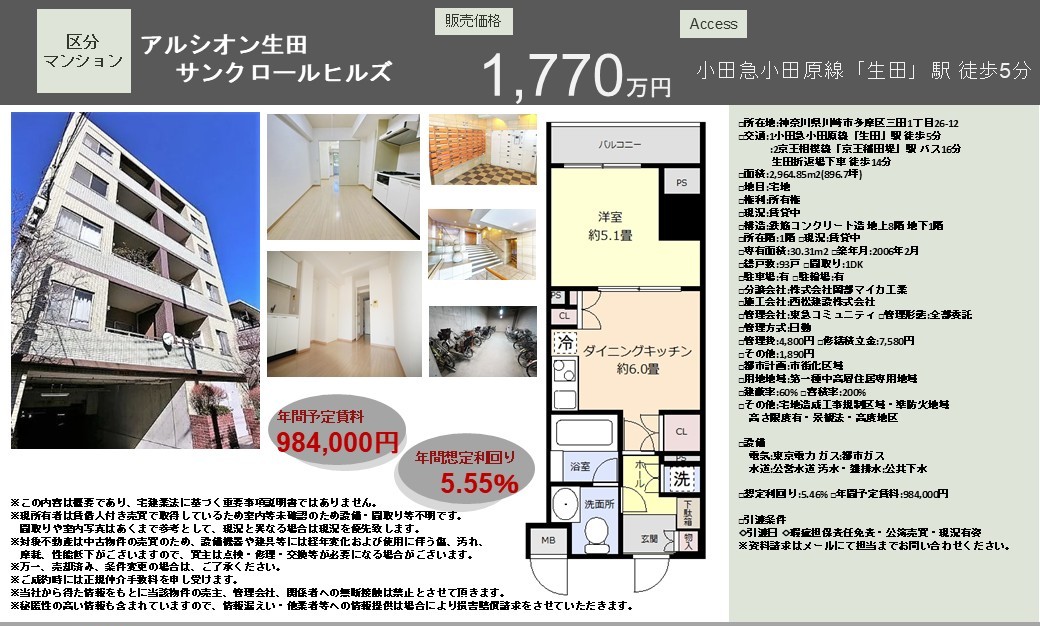 交通:小田急小田原線「生田」駅わずか徒歩5分!幅広い層からの安定した入居者ニーズが見込めます。