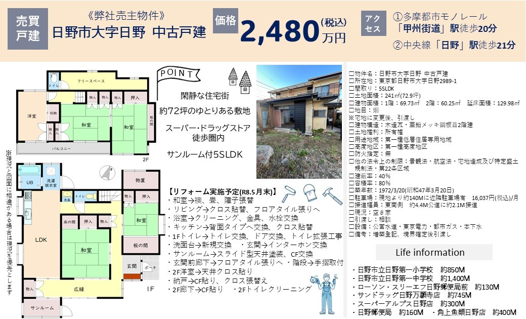 本日は【弊社売主物件】日野市大字日野 中古戸建 2,480万円のご紹介です。