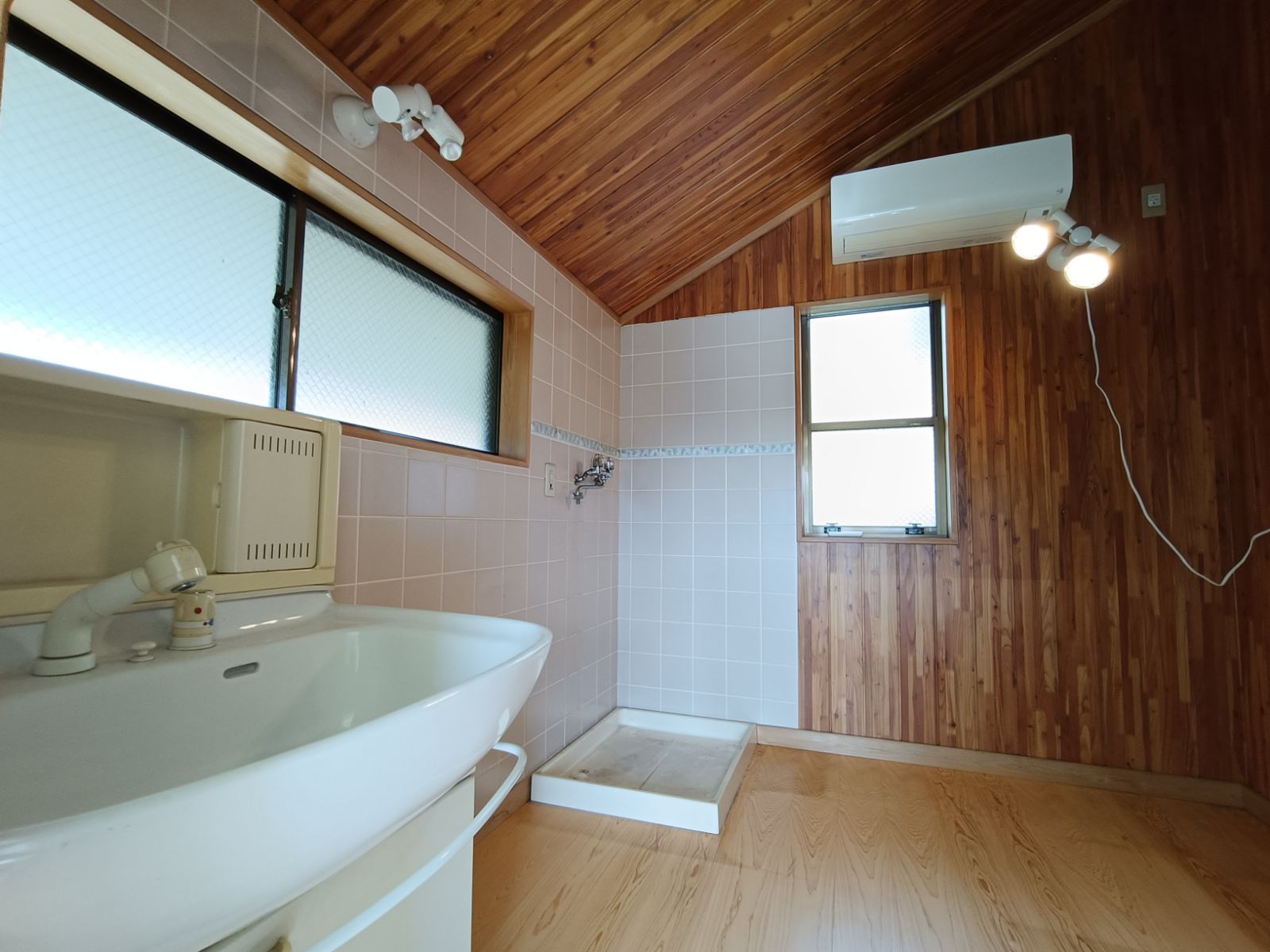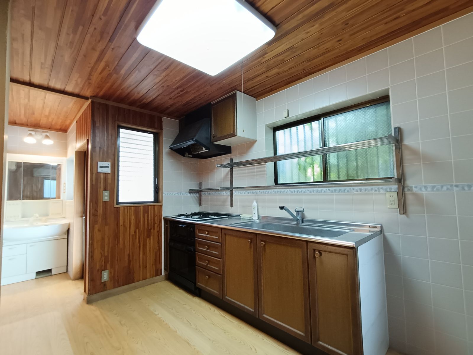・天井に天然木使用のキッチンです。キッチンから外に出る事ができます。