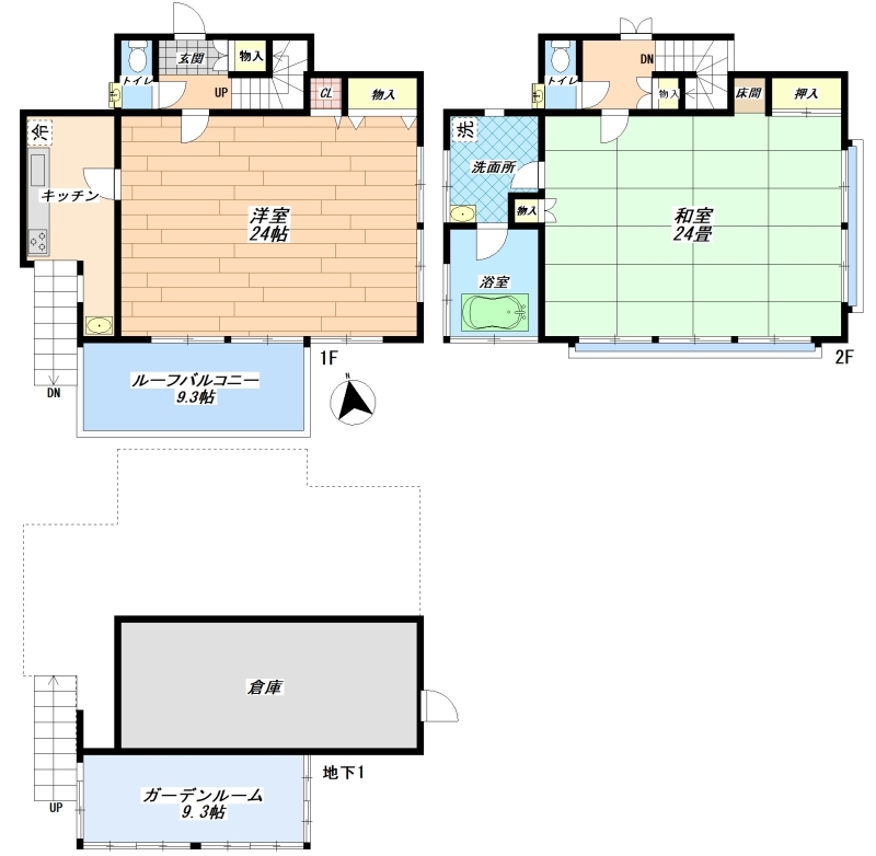 ・間取り:2K+ガーデンルーム+地下物置+ルーフバルコニー
